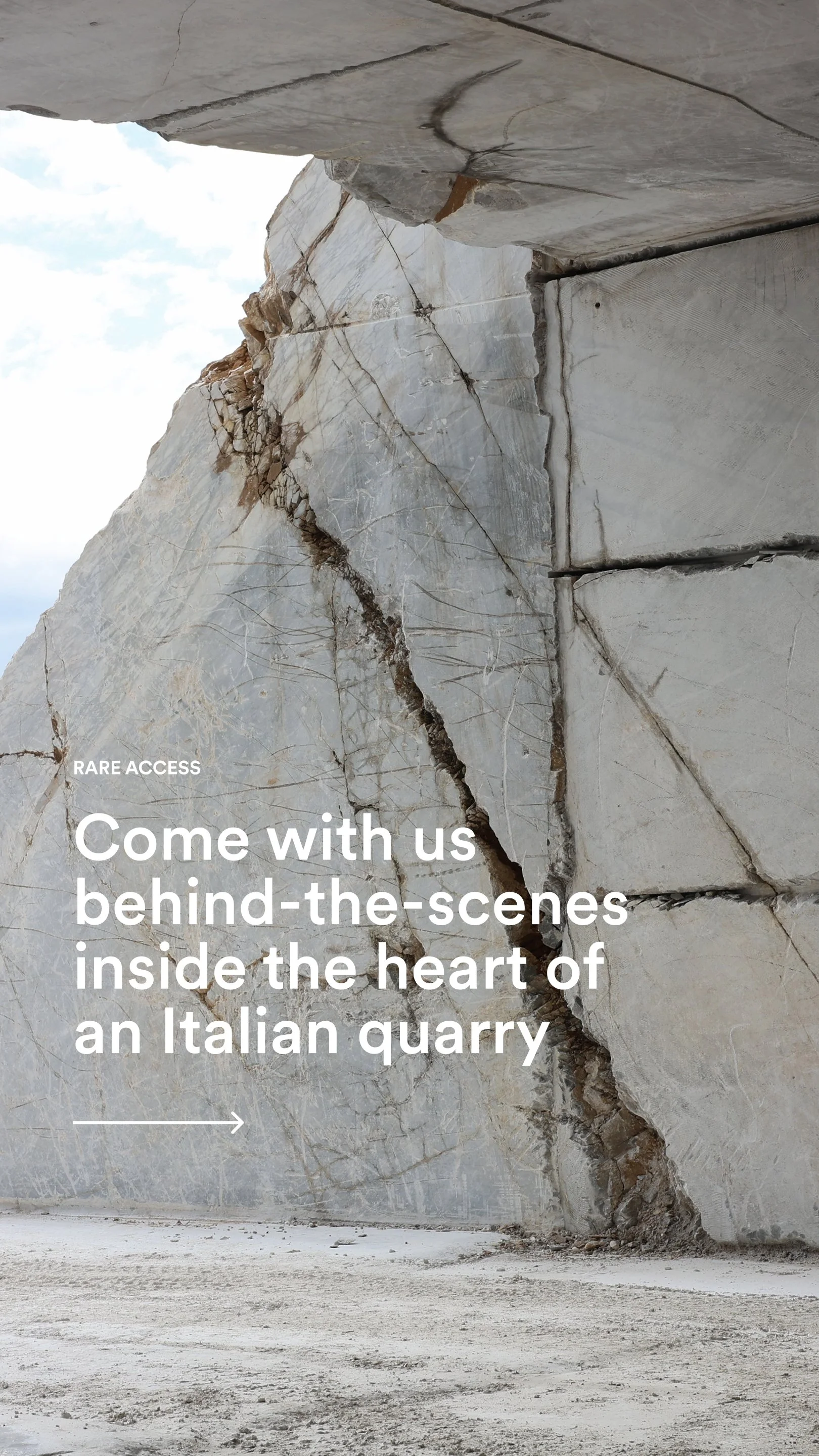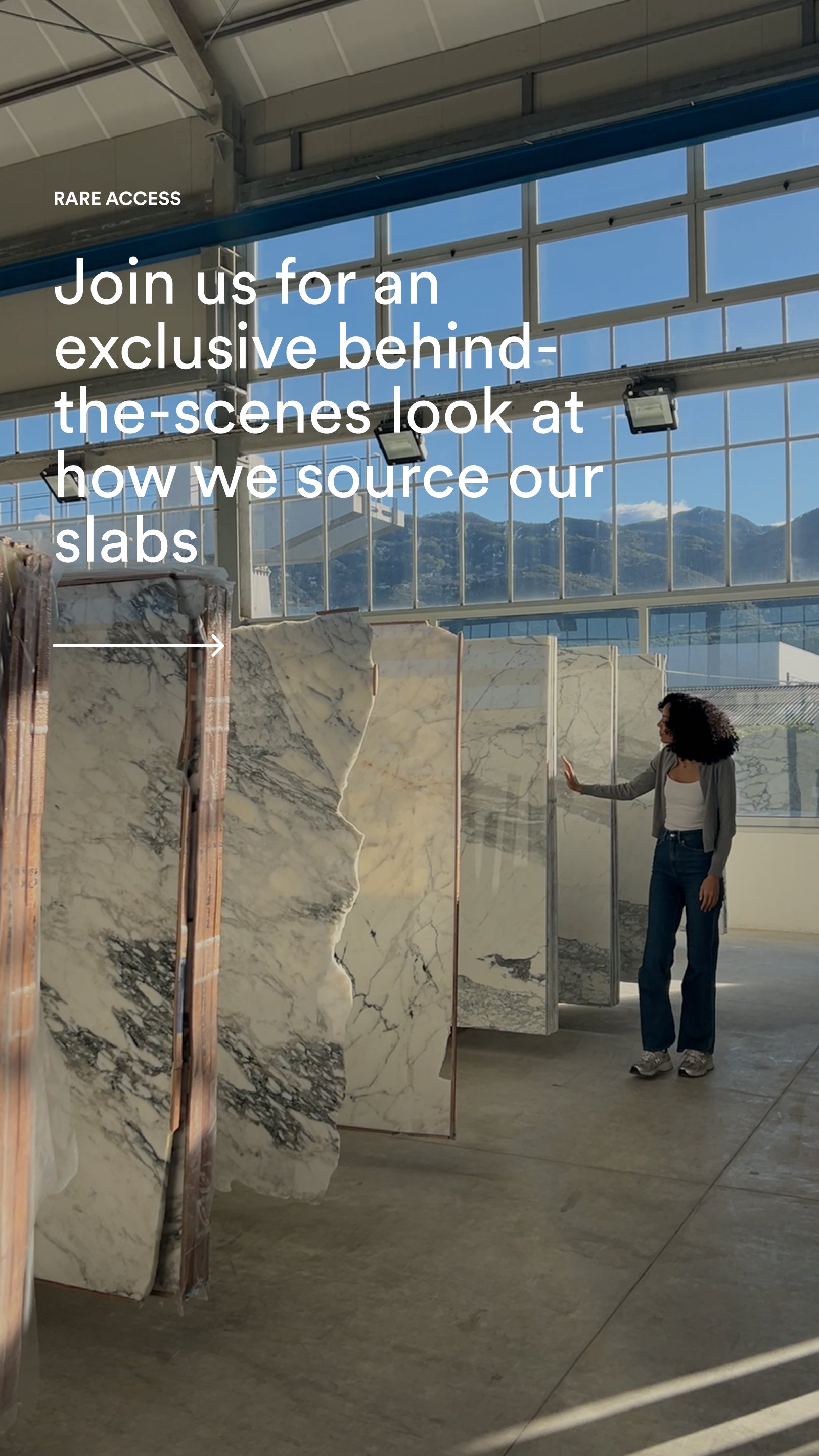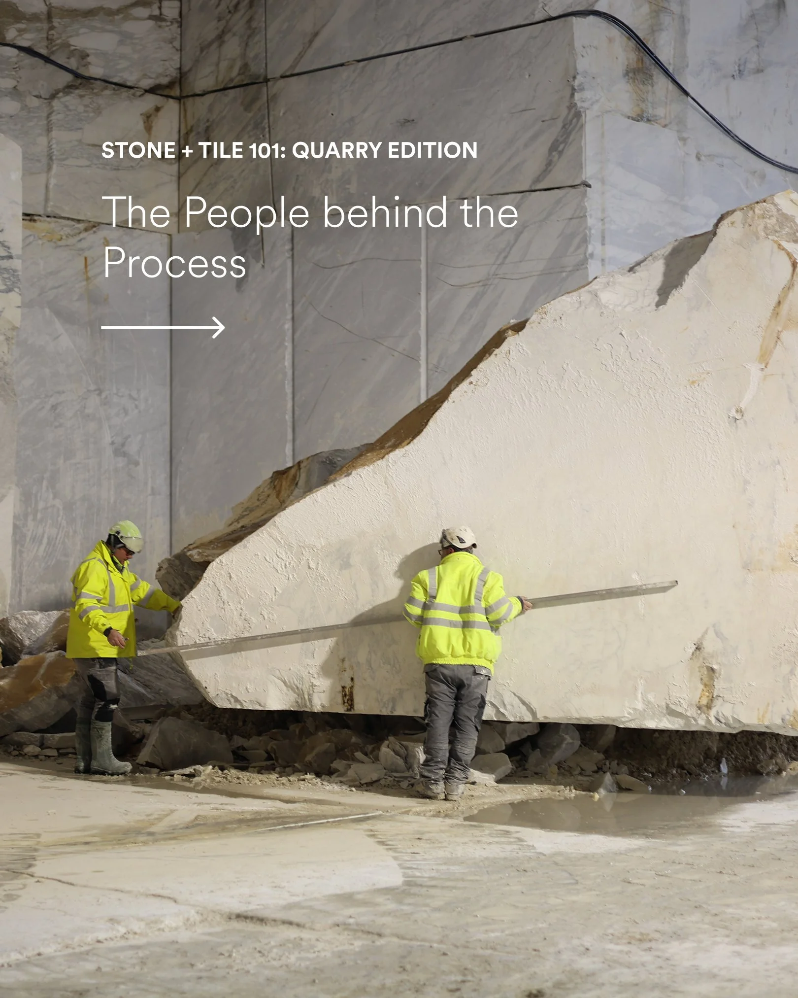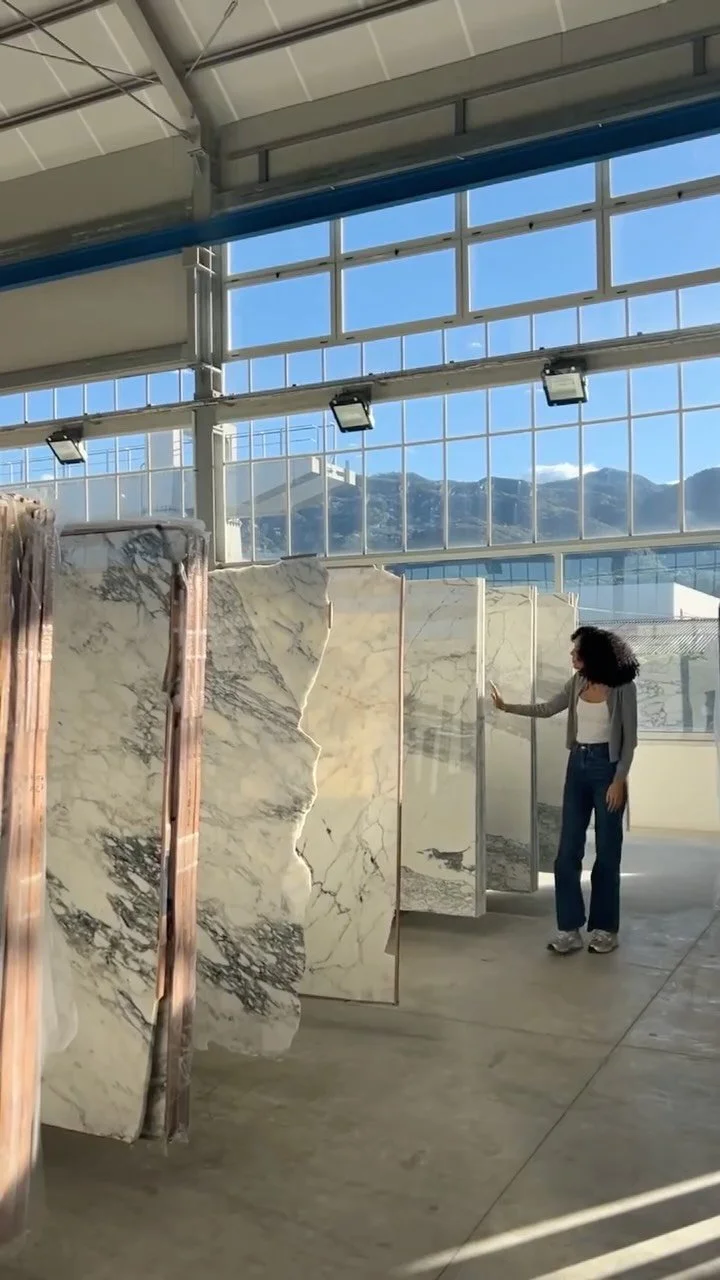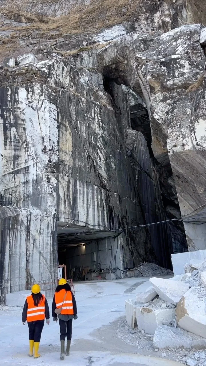 She was there in Italy, standing in the mountains where it all begins — witnessing the raw beauty of the stone in its purest form. Seeing the scale, the texture, the extraction — it transformed the way we chose to tell this story.